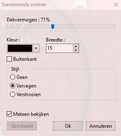 | 1 2 3 4 ************************************** Les 41 Kerstles 2019 ![]() Gemaakt in PFSX **************************************************** ![]() ******************************************* Zet deze kleuren in je kleurenpalet ![]() *************************************************************** 1. Open een nieuw afbeelding 800 bij 600/ Voorgrondkleur 2. Laag/ Nieuw/ Leeg/ Automatische transparantie 3. Vul de laag met het emmertje (achtergrondkleur) 4. Filter/ Photo Masqué ![]() 5. Klik rechts/ Opties/ Slagschaduw/ alles staat gelijk goed 6. Schaduw samenvoegen 7. Laag/ Alle lagen samenvoegen 8. Trek een Ovaal met het Selectie gereedschap (Maakt niet uit hoe groot) 9. Selectie/ Handmatig instellen/ X 230 en Y 33/ Breedte 560 Hoogte 560 (geen vinkje Hoogte Breedte) 10. Klik rechts/ Dupliceren 11. Laag/ Centreer laag/ Horizontaal centreren 12. Filter/ Stileren/ Toenemende omtrek ![]() 13. Selectie verbergen 14. Ga naar de achtergrond 15. Dupliceren 16. Klik rechts op laag/ Handmatig instellen X -296 en Y -45 ![]() 17. Dupliceren/ Horizontaal spiegelen 18. Klik rechts op laag/ Handmatig instellen X 296 en Y -45 19. Open plaatje MN0007 (vrouw) 20. Kopiëren/ Plakken op de bovenste laag 21. Horizontaal spiegelen/(Gum de handtekening weg) 22. Handmatig instellen X -18 en Y 47 Breedte 465 Hoogte 552 23. Opties/ slagschaduw (staat gelijk goed) 24. Open plaatje Merry Christmas 25. Kopiëren/ Plakken 26. Vrij aanpassen/ Schaal 45 27. Zet zoals je ziet op het voorbeeld 28. Open plaatje ster/ Kopiëren/ Plakken 29. Nog 2x Dupliceren 30. 1X Vrij aanpassen/ Schaal 70 zet aan de rechterkant 31. 1X Vrij aanpassen/ Schaal 140 zet aan de linkerkant 32. Lagen van de sterren samenvoegen 33. Aanpassen/ Gammacorrectie ![]() 34. Opties/ Slagschaduw (gelijk goed 35. Zo staan de lagen 36. Laag/ Alle lagen samenvoegen 37. Filter/ Stileren/ Toenemende omtrek ![]() 38. Afbeelding/ Kader toevoegen Breedte 2/(licht) achtergrondkleur / 1 (donker) Voorgrondkleur/ 60 licht/ 1 donker/ 2 licht/ 1 donker 39. Selecteer met het toverstafje de rand van 60 40. Filter/ Photo Masque ![]() 41. Filter/ Reliëf/ Reliëf 42. Laat de selectie staan 43. Filter/ stileren/ toenemende omtrek ![]() 44. Selectie verbergen 45. Open het plaatje pakje (korob 43k )/ Kopiëren/ Plakken 46. Vrij aanpassen/ Schaal op A 60 (zet het rechts onder) 47. Zet je naam op het werkje 48. Laag/ Alle lagen samenvoegen 49. Afbeelding/ Afmetingen afbeelding/ Breedte 800 Veel plezier met het maken van dit lesje Geschreven 17-12-2019 Ada van Buren ![]() *************************************** 1 2 3 4 | |||||||||||||