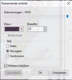 | 1 2 3 4 ************************************** Les 6 Lavendel ![]() ************************************************* ![]() *********************************************************************** ![]() ******************************************** 1. Open nieuwe laag 800 bij 600 achtergrond kleur blauw 2. Selectie/ Handmatig instellen X 145 Y124 Breedte 505 Hoogte 351 Geen vinkje Hoogte/Breedte/ Rechthoek 3. Dupliceren /Selectie /Selectie tonen 4. Filter /Stileren /Toenemende omtrek Dekvermogen 100 / Voorgrond kleur/ Breedte 10/ Vervagen ![]() 5. Open plaatje 441185258/Kopiëren/Plakken/ Vrij aanpassen /Schaal 55 6. Laag/Kadereffect/Straal 58/ zet in het midden van vierkant 7. Laag 2 en laag 1 samenvoegen 8. Dupliceren /Vrij aanpassen / Hoek -19,90 9. Nog 6 X Herhalen tot je 8 vierkanten heeft 10. Zet laag 1 boven laag 7 11. Sla het werkje op /Bestand/Opslaan als / Photo Filtre PFI bestand 12. Open plaatje 78/Kopiëren/Plakken 13. Afbeelding/vervormen/ 90 gr roteren 14. Vrij Aanpassen/ Hoek 25,60/ OK (zet het op de plaats ) 15. Opties /Slagschaduw/ X7 Y7 /Kleur Zwart/ Dekvermogen 30 ![]() 16. Schaduw samenvoegen 17. Dupliceren/Horizontaal spiegelen /Vrij aanpassen Schaal 50/Hoek 86,30 18. Dupliceren/Horizontaal Spiegelen /zet achter laag 1 (zie voorbeeld ) 19. Open plaatje Vrouw/Kopiëren/Plakken/Vrij aanpassen/ Schaal 118 (zet links) 20. Slagschaduw X7 / Y30 Kleur Zwart/ Dekking 40 % 22. Ga naar de achtergrond / Filter/ Textuur / Overig ![]() 23. Laag /alle lagen samenvoegen 24. Filter/ Stileren/ Dekvermogen100/Voorgrond grond kleur/ breedte10/ vervagen ![]() 25. Afbeelding/Kader toevoegen/ Breedte 1 blauw/ 3 Paars/ 2 Blauw/ 3 Paars/ 40 blauw 26. Ga met het toverstafje in de blauwe rand staan 27. Filter/ Textuur/ Overig 28. Herhaal punt 24 29. Afbeelding/ Kader toevoegen/ Breedte 1 Blauw/ 3 paars/2 blauw 30. Tekst/ Lettertype Ravie/ Afmeting 20/ Cursief/ kleur Paars/ Tekst invoer Lavendel 31. Zet het op de plaats 32. Ze je naam op het werkje 33. Alle lagen samenvoegen 34. Afbeelding/ Afmetingen afbeelding/ Breedte 800 Veel plezier met het maken van dit lesje Ada van Buren 2-7-2018 ![]() Creatie van Gerkje *************************************** 1 2 3 4 | |||||||||||||