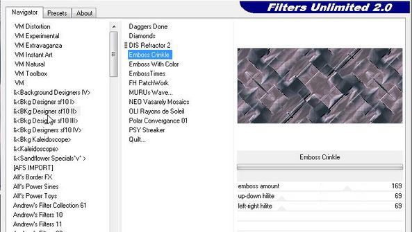 1 2 3 4 5 ************************************ Amelyne ![]() Gemaakt met PFS X 10.10.1 **************************************************** Gebruikte filters 8bf: Importeren naar Unlimited: &<Bkg Kaleidoscope>/ @Mirrored & Scaled/ &>BKG Designer sf10 II/ Emboss Crinkle (deze vind je in de map met materialen) Simple/ DiamondsToadies/ Ommadown en What Are You? Andere filters 8bf: Mehdi/ Wavy Lab 1.1 en Sorting Tiles Simple/ Quick Tile Carolaine and Sensibility/ Cs_Texture ************************************************************************* ![]() ************************************** Met dank aan Riet en Ans voor het controleren van de les. ************************************************************************* Zet onderstaande kleuren in je Aangepaste kleurenpalet: ![]() ************************************************************************* 1. Open een nieuwe afbeelding van 650 x 450/ wit. 2. Filter 8bf/ Mehdi/ Wavy Lab 1.1: ![]() 3. Filter/ Visueel effect/ Gaussiaanse vervaging/ 30 4. Filter 8bf/ Mehdi/ Sorting Tiles: ![]() 5. Filter 8bf/ Simple/ Quick Tile: ![]() 6. Laag/ Dupliceren. 7. Selectie/ Selectievorm laden/ laad de vorm S.Amelyne.01. 8. Klik op de Deletetoets van je toetsenbord. 9. Selectie/ Verbergen. 10. Filter 8bf/ Carolaine and Sensibility/ Cs_Texture: ![]() 11. Filter/ Stileren/ Toenemende omtrek: ![]() 12. Selectie/ Verbergen. 13. Klik op de achtergrond. 14. Laag/ Dupliceren. 15. Selectie/ Selectievorm laden/ laad vorm S.Amelyne.02. 16. Klik op de Deletetoets van je toetsenbord. 17. Selectie/ Selecteer laag. 18. Filter 8bf/ Unlimited/ >&Bkg Kaleidoscope/ @Mirrored Scaled: ![]() 19. Filter 8bf/ Unlimited/ Simple/ Diamonds: ![]() 20. Filter 8bf/ &<BKG Designer sf10 II/ Emboss Crinkle: ![]() 21. Selectie/ Verbergen. 22. Zet de Mengmodus op Overlay: ![]() 23. Laag/ Nieuw/ Leeg/ achtergrondkleur. 24. Laag/ Opties/ zet de Dekking op 10%: ![]() 25. De lagen zien er nu zo uit: ![]() 26. Klik op de bovenste laag/ laag 1. 27. Laag/ Dupliceren. 28. Klik op laag 1. 29. Laag/ Samenvoegen met vorige laag. ![]() 30. Filter 8bf/ Unlimited/ Toadies/ Ommadawn: ![]() 31. Laag/ Handmatig instellen: X = 119 en Y = 0. 32. Zet de Mengmodus op Hard Light: ![]() 33. Klik op laag 2. 34. Filter/ Stileren/ Toenemende omtrek: ![]() 35. Selectie/ Verbergen. 36. Klik op laag 4, de bovenste laag. 37. Filter8bf/ Unlimited/ Toadies/ What Are You?: ![]() 38. Voeg alle lagen samen. 39. Laag/ Nieuw/ Leeg/ achtergrondkleur. 40. Selectie/ Selectievorm laden/ laad de vorm S.Amelyne.03. 41. Klik op de Deletetoets van je toetsenbord. 42. Selectie/ Selecteer laag. 43. Selectie/ Verkleinen/ 3. 44. Klik op de verfpot en klik binnen de selectie. Zo ziet het er dan uit. ![]() 45. Selectie/ Verbergen. 46. Filter/ Stileren/ Toenemende omtrek: ![]() 47. Selectie/ Verbergen. 48. Open de tube "deco glass". 49. Kopieer de tube en plak deze op je werk. 50. Plaats de tube over de blokjes. 51. Voeg de lagen samen. 52. Kopieer de teksttube "text-02=0_a593". 53. Kopieer de tube en plak deze op je werk. 54. Plaats de tube zoals je ziet op het voorbeeld. 55. Aanpassen/ Negatief. 56. Dubbelklik op de laag/ Slagschaduw: ![]() 57. Voeg de lagen samen. 58. Bewerken/ Patroon selecteren. 59. Afbeelding/ Kader toevoegen: breed 2/ achtergronkleur breed 1/ voorgrondkleur breed 2/ achtergrondkleur breed 45/ wit 60. Selecteer met de toverstaf het witte kader. 61. Bewerken/ Vullen met patroon. 62. Filter/ Visueel effect/ Gaussiaanse vervaging/ 50. 63. Filter 8bf/ Unlimited/ Toadies/ What Are You?: ![]() 64. Filter/ Reliëf/ Reliëf. 65. Selectie/ Omgekeerd. 66. Filter/ Stileren/ Toenemende omtrek: ![]() 67. Selectie/ Verbergen. 68. Filter 8bf/ AAA Frames/ Foto Frame: ![]() 69. Open de tube "SvB (877) Beauty". 70. Kopieer de tube en plak deze op je werk. 71. Plaats de tube naar links. Zie voorbeeld. 72. Haal de handtekening weg met het gummetje. 73. Dubbelklik op de laag/ Slagschaduw: ![]() 74. Voeg de lagen samen. 75. Zet je naam op het werk en voeg de lagen weer samen. 76. Afbeelding/ Kader toevoegen/ breed 1/ kleur zwart. 77. Afbeelding/ Afmetingen afbeelding/ 700 breed. Veel plezier met het maken van deze door mij vertaalde les van manany. Merci Manany! *************************************** 1 2 3 4 5 | |||||||||||||