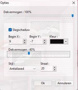 ********************************************************** 1. Open een nieuwe afbeelding van 650 x 450/ wit. 2. Filter 8bf/ Mehdi/ Wavy Lab 1.1: ![]() 3. Filter 8bf/ Mehdi/ Sorting Tiles: ![]() 4. Filter 8bf/ Unlimited/ Simple/ Pizza Slice Mirror: ![]() 5. Filter 8bf/ Unlimited/ Simple/ 4 Way Average: ![]() 6. Laag/ Dupliceren. 7. Filter 8bf/ Unlimited/ Tile & Mirror/ XY Offset 50% (positive): ![]() 8. Filter/ Simple/ Quick Tile: 9. Zet de Dekking op 50. 10. Voeg de lagen samen. 11. Laag/ Dupliceren. 12. Selectie/ Selectievorm laden/ laad de vorm S.Ines.01. 13. Bewerken/ Wissen of klik op Delete. 14. Selectie/ Selecteer laag. 15. Filter 8bf/ Carolaine and Sensibility/ CS-HLines: 16. Filter/ Stileren/ Toenemende omtrek: ![]() 17. Selectie/ Verbergen. 18. Laag/ Dupliceren. 19. Laag/ Vervormen/ Horizontaal spiegelen. 20. Klik op de achtergrond. 21. Filter 8bf/ Unlimited/ Simple/ Half Wrap: ![]() 22. Open de tube vvs-paisagem0593. 23. Kopieer de tube en plak deze op de achtergrond. 24. Zet de Mengmodus op Hard Light. 25. Klik op de bovenste laag. 26. Laag/ Nieuw/ Leeg/ kleur 3. 27. Selectie/ Selectievorm laden/ laad de vorm S.Ines.02. 28. Bewerken/ Wissen of klik op Delete. 29. Selectie/ Selecteer laag. 30. Selectie/ Verkleinen/ 10. 31. Bewerken/ Omkaderen en vullen/ Streep/ kleur wit/ breedte 2. 32. Selectie/ Verbergen. 33. Filter/ Stileren/ Toenemende omtrek: ![]() 34. Selectie/ Verbergen. 35. Open de tube deco cadre. 36. Kopieer de tube en plak deze op je werk. 37. Zet de mengmodus op Hard Light. 38. Klik op laag 2, de paysage laag. 39. Laag/ Nieuw/ Leeg/ wit. 40. Filter/ PhotoMask: ![]() 41. Dubbelklik op de laag/ Slagschaduw: ![]() 42. Klik op de achtergrond. 43. Bewerken/ Patroon selecteren. 44. Laag/ Alle lagen samenvoegen. 45. Afbeelding/ Kader toevoegen: breedte 2/ kleur 3 breedte 2/ kleur 2 breedte 2/ kleur 3 breedte 45/ kleur wit 46. Selecteer met de toverstaf het witte kader. 47. Bewerken/ Vullen met patroon. 48. Filter 8bf/ Unlimited/ Simple/ 4 Way Average: ![]() 49. Selectie/ Omgekeerd. 50. Filter/ Stileren/ Toenemende omtrek: ![]() 51. Selectie/ Omgekeerd. 52. Filter 8bf/ Unlimited/ Graphics Plus/ Quick Tile 1: ![]() 53. Selectie/ Verbergen. 54. Open de tube deco glass. 55. Kopieer de tube en plak deze op je werk. 56. Open de tube personnage_enfant3_tine_01.2022-546. 57. Wis de handtekening weg met het gummetje. 58. Afbeelding/ Afmetingen afbeelding/ Hoogte = 582. 59. Kopieer de tube en plak deze op je werk. 60. Laag/ Vervormen/ Horizontaal spiegelen. 61. Plaat het meisje zoals je ziet op het voorbeeld. 62. Dubbelklik op de laag/ Slagschaduw: ![]() 63. Voeg de lagen samen. 64. Afbeelding/ Kader toevoegen/ Breedte 1/ kleur zwart. 65. Zet je naam op het werk en voeg de lagen weer samen. Veel plezier met het maken van dit door mij vertaalde lesje van Manany. Merci Manany! *************************************** 1 2 3 4 5 | |||||||||||||
