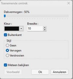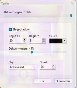 1 2 3 4 5 ************************************ VERONIQUE ![]() Gemaakt met PFS X ******************************** Gebruikte filters 8bf: Importeren naar Unlimited: Mura`s Seamless/ Stripe Mura`s Seamless/ Warp at Wave /Quick Tile 1 Andere filters 8bf: Mehdi/ Wavy Lab 1.1 Mehdi/ Sorting Tiles Simple/ Quick Tile AAA Frame/ Foto Frame *************************************************************** ![]() ************************************* Ik wil Riet bedanken voor het controleren van de les! ************************************************************* Zet onderstaande kleuren in je Aangepaste kleurenpalet: ![]() ********************************************************** 1. Open een nieuwe afbeelding van 650 x 450/ wit 2. Filter 8bf/ Mehdi/ Wavy Lab 1.1: ![]() 3. Filter 8bf/ Mehdi/ Sorting Tiles: ![]() 4. Filter 8bf/ Simple/ Quick Tile: ![]() 5. Laag/ Dupliceren 6. Zet de Mengmodus op Soft light 7. Laag/ Samenvoegen met vorige laag 8. Laag/ Dupliceren 9. Filter 8bf/ Unlimited/ Mura`s Seamless/ Stripe: ![]() 10. Filter 8bf/ Mura`s Seamless/ Warp at Wave: 11. Zet de Mengmodus op Hard light 12. Laag/ Dupliceren 13. Laag samenvoegen met vorige laag 14. Klik op de achtergrond 15. Filter 8bf/ AAA Frames/ Foto Frame: 16. Filter 8bf/ Simple/ Quick Tile: ![]() 17. Voeg alle lagen samen 18. Laag/ Dupliceren 19. Selectie/ Selectie vorm laden/ laad de vorm S.Veronique.01 20. Klik op Delete 21. Selectie/ Selecteer laag 22. Filter 8bf/ Unlimited/ Graphics Plus/ Quick Tile 1: ![]() 23. Laag/ Dupliceren 24. selectie/ Selecteer laag 25. Filter/ Vervormen/ Ovaal 26. Selectie/ Verbergen 27. Laag/ Handmatig instellen: verwijder het vinkje bij Hoogte / breedte verhouding/ X = 337 en Y = 73/ Breedte en Hoogte = 200 28. Klik op laag 1 29. Selectie/ Selecteer laag 30. Filter 8bf/ AAA Frames/ Foto Frame: ![]() 31. Klik rechts op laag 2/ Samenvoegen met vorige laag 32. Filter/ Stileren/ Toenemende omtrek: ![]() 33. Selectie/ Verbergen 34. Open de tube Deco Glass 35. Kopieer de tube en plak deze op je werk 36. Laag/ Samenvoegen met vorige laag 37. Laag/ Dupliceren 38. Laag/ Handmatig instellen: X = 228 en Y = 213/ Breedte 345 39. Laag/ Alle lagen samenvoegen 40. Afbeelding/ kader toevoegen: Breedte 2/ voorgrondkleur breedte 2/ achtergrondkleur breedte 2/ voorgrondkleur breedte 45/ kleur wit 41. Selecteer met de toverstaf het witte kader 42. Filter 8bf/ Mehdi/ Wavy Lab 1.1: ![]() 43. Filter/ Textuur/ Zebrahuid 44. Selectie/ Omgekeerd 45. Filter/Stileren/ Toenemende omtrek: ![]() 46. Selectie/ Verbergen 47. Filter 8bf/ AAA Frames/ Foto Frame: ![]() 48. Open de tube SuizaBella 49. Verwijder de handtekening 50. Afbeelding/ Afmetingen afbeelding/ Hoogte = 583 51. Kopieer de tube en plak deze op je werk 52. Laag/ Vervormen/ Horizontaal spiegelen 53. Plaats de dame zoals je ziet op het voorbeeld 54. Dubbelklik op de laag/ Slagschaduw: 55. Open de tekst tube 56. Kopieer de tekst en plak deze op je werk 57. Plaats de tekst zoals je ziet op het voorbeeld 58. Open de tube filigrame 59. Kopieer de tube en plak deze op je werk 60. Plaats deze waar je wilt 61. Zet je naam op het werk en voeg alle lagen samen 62. Afbeelding/ Kader toevoegen/ breedte 1/ kleur zwart Veel plezier met het maken van dit door mij vertaalde lesje van Manany. Merci Manany! *************************************** 1 2 3 4 5 | |||||||||||||