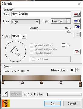 ************************************** ARMELLE Gemaakt met PFS X 10.10.1 *********************************************************************** ![]() ************************** Ik wil Riet bedanken voor het controleren van de les! **************************************************************** Zet onderstaande kleuren in je Aangepaste kleurenpalet: ![]() ******************************************************************* 1. Open een nieuwe afbeelding van 700 x 550/ wit. 2. Filter/ Plugin/ Gradient/ kleuren 1 en 3 = voorgrondkleur en kleur 2 = achtergrondkleur: ![]() 3. Filter/ Visueel effect/ Gaussiaanse vervaging/ 30. 4. Herhaal Gaussianse vervaging nog 2 x. 5. Filter/ PhotoMask: ![]() 6. Open tube dentelle. 7. Kopieer de tube en plak deze op je werk. 8. Handmatig instellen: X = 0 en Y = -68. 9. Zet de Mengmodus op Helderheid. 10. Voeg de lagen samen. 11. Open de met de 2 dames. 12. Kopieer de tube en plak deze op je werk. 13. Handmatig instellen: X = -152 en Y = 50. 14. Zet de Mengmodus op Helderheid. 15. Open de tube met het meisje. 16. Kopieer de tube en plak deze op je werk. 17. Laag/ Vervormen/ Horizontaal spiegelen. 18. Handmatig instellen: X = 425 en Y = -14/ Breedte = 270. 19. Zet de Mengmodus op Helderheid. 20. Voeg de laag samen met de vorige laag. 21. Dubbelklik op de laag/ Slagschaduw: ![]() 22. Voeg de lagen samen. 23. Open de afbeelding met de trein. 24. Kopieer de afbeelding en plak hem op je werk. 25. Handmatig instellen: X = 245 en Y = 226. 26. Laag/ Transparantie/ Transparant verloop/ Radiaal. 27. Zet de Mengmodus op Helderheid. 28. Voeg samen met de achtergrond. 29. Afbeelding/ Kader toevoegen: Breedte 2/ kleur wit breedte 15/ voorgrondkleur breedte 2/ kleur wit 30. Selecteer het middelste kader met de toverstaf. 31. Filter/ Plugin/ Gradient/ hetzelfde als in het begin, maar dan met 5 kleuren. De voor en achtergrondkleur steeds afwisselen/ Angle op 315: ![]() 32. Filter/ Textuur/ Grof gaas. 33. Zet je naam op het werk en voeg de lagen samen. 34. Afbeelding/ Afmetingen afbeelding/ Breedte 700. Veel plezier met dit door mij vertaalde lesje van Papy. Merci Papy. *************************************** 1 2 3 | |||||||||||||